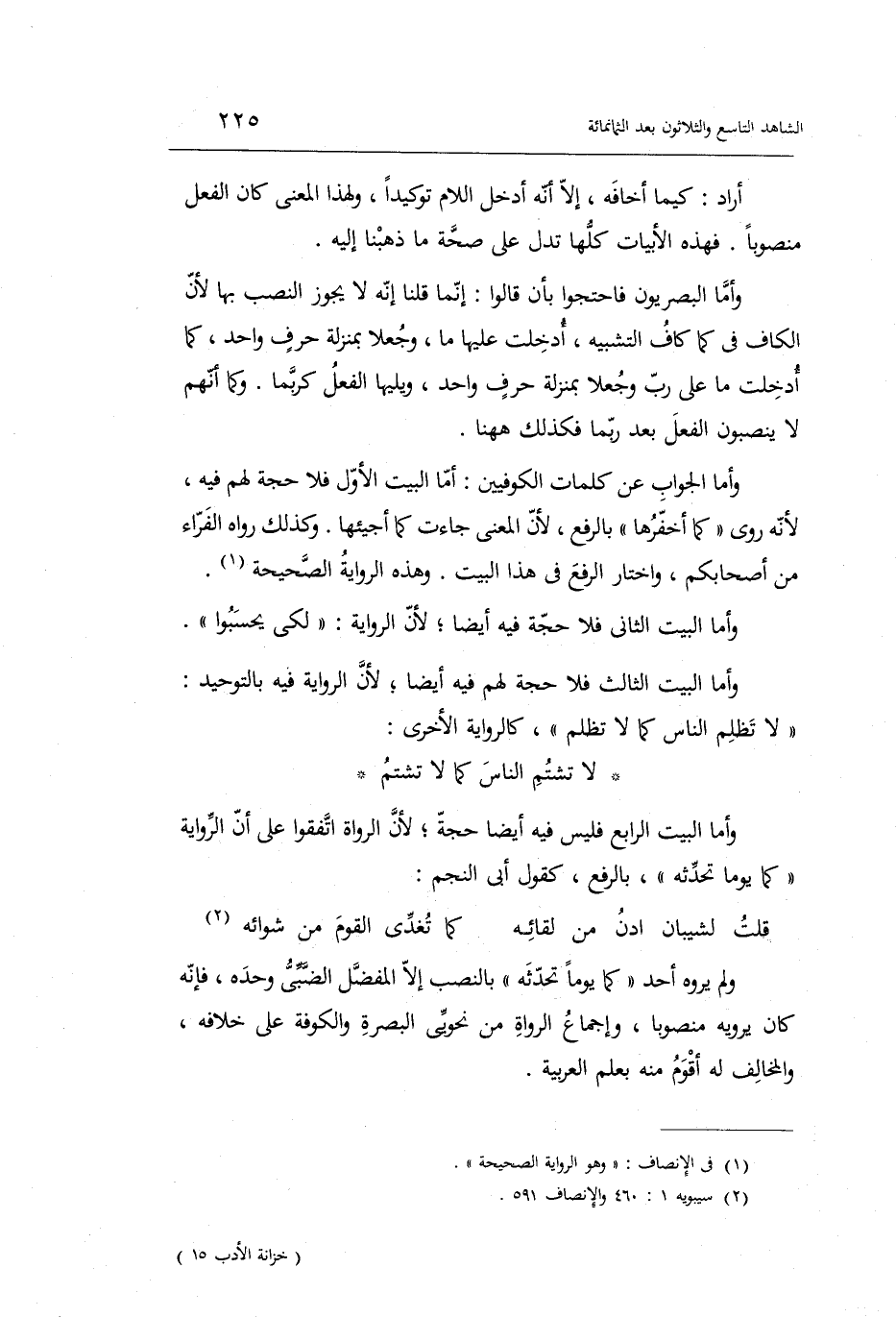 وَأما الْبَيْت الثَّالِث فَلَا حجَّة لَهُم فِيهِ أَيْضا لِأَن الرِّوَايَة فِيهِ بِالتَّوْحِيدِ: لَا تظلم النَّاس كَمَا لَا تظلم كالرواية الْأُخْرَى: وَأما الْبَيْت الرَّابِع فَلَيْسَ فِيهِ أَيْضا حجَّة لِأَن الروَاة اتَّفقُوا على أَن الرِّوَايَة كَمَا يَوْمًا تحدثه بِالرَّفْع كَقَوْل أبي النَّجْم: