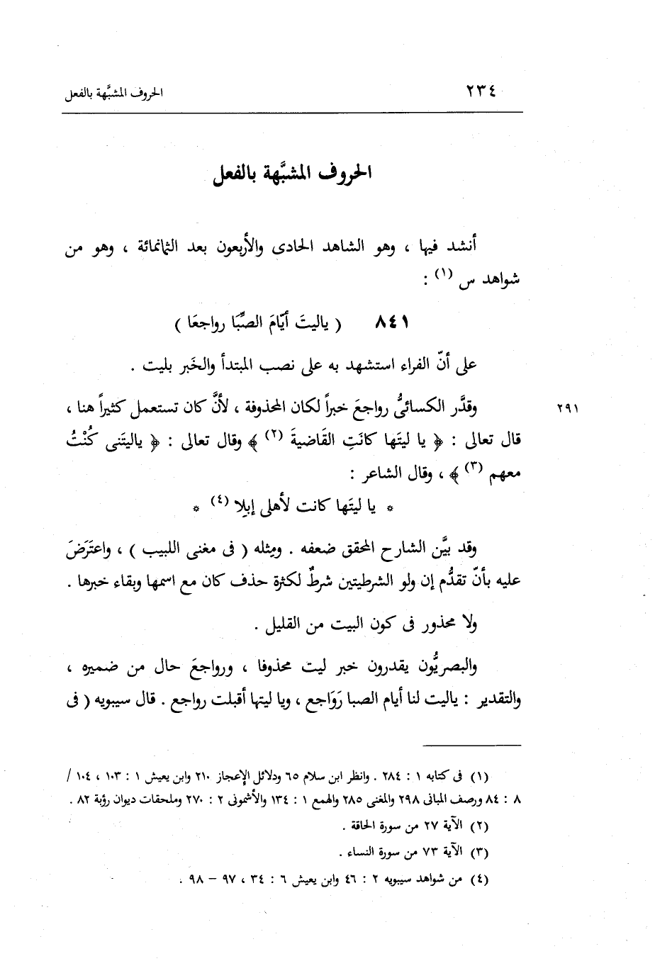 وَهُوَ من شَوَاهِد س: يَا لَيْت أَيَّام الصِّبَا رواجعا على أَن الْفراء اسْتشْهد بِهِ على نصب الْمُبْتَدَأ وَالْخَبَر ب لَيْت.