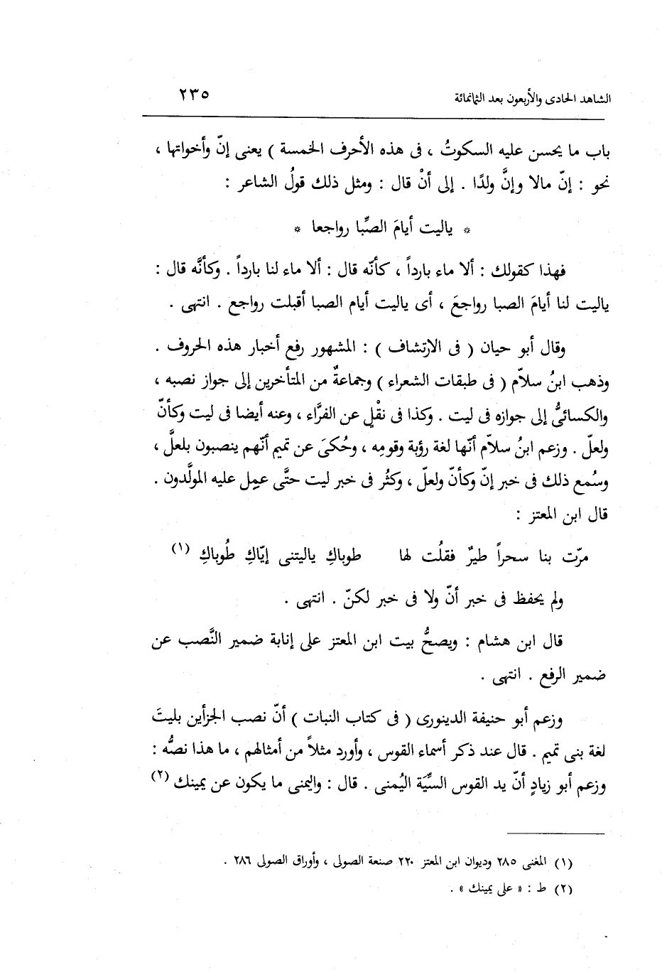 إِلَى أَن قَالَ: وَمثل ذَلِك قَول الشَّاعِر: يَا لَيْت أَيَّام الصِّبَا رواجعا فَهَذَا كَقَوْلِك: أَلا مَاء بَارِدًا كَأَنَّهُ قَالَ: أَلا مَاء لنا بَارِدًا. وَكَأَنَّهُ قَالَ: يَا لَيْت لنا أَيَّام الصِّبَا رواجع أَي: يَا لَيْت أَيَّام الصِّبَا أَقبلت رواجع. انْتهى.