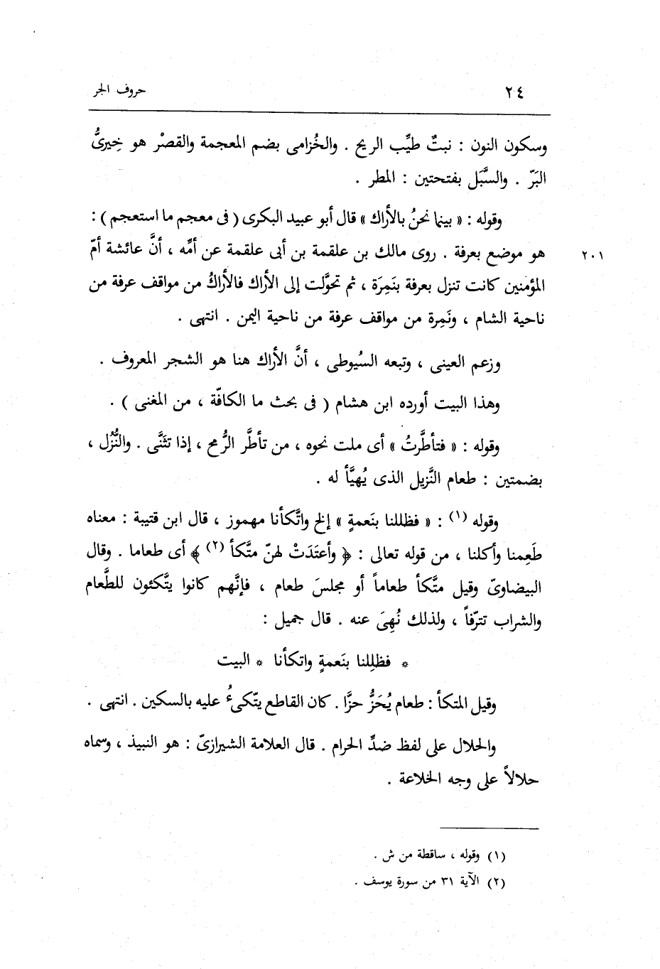 وَقَالَ الْبَيْضَاوِيّ: وَقيل: متكأً طَعَاما أَو مجْلِس طَعَام فَإِنَّهُم كَانُوا يتكئون للطعام وَالشرَاب تترفاً وَلذَلِك نهي عَنهُ. قَالَ جميل: فظللنا بِنِعْمَة واتكأنا الْبَيْت وَقيل: المتكأ: طَعَام يحز حزاً. كَانَ الْقَاطِع يتكئ عَلَيْهِ بالسكين. انْتهى. والحلال على لفظ ضد الْحَرَام. قَالَ الْعَلامَة الشِّيرَازِيّ: هُوَ النَّبِيذ وَسَماهُ حَلَالا على وَجه الخلاعة.
