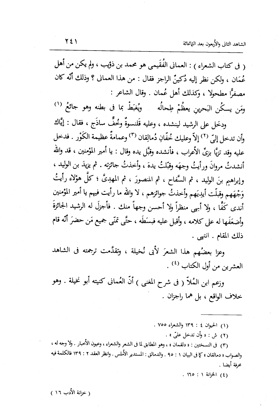وَزعم ابْن الملا فِي شرح الْمُغنِي أَن الْعمانِي كنيته أَبُو نخيلة. وَهُوَ خلاف الْوَاقِع بل هما راجزان.