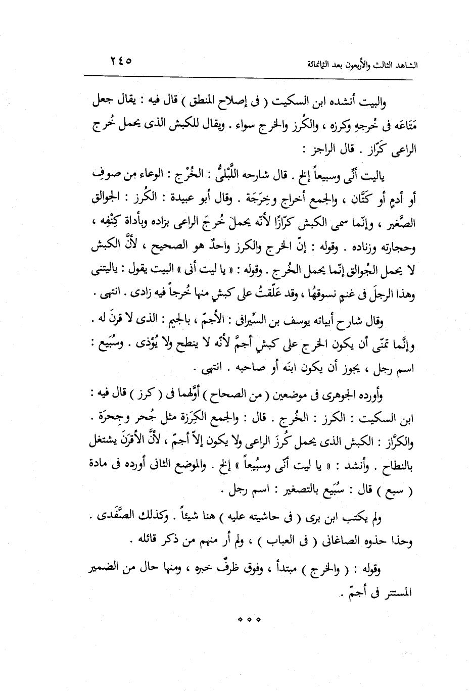 وَالْبَيْت أنْشدهُ ابْن السّكيت فِي إصْلَاح الْمنطق قَالَ فِيهِ: يُقَال: جعل مَتَاعه فِي خرجه وكرزه والكرز والخرج سَوَاء. وَيُقَال للكبش الَّذِي يحمل خرج الرَّاعِي: كراز. قَالَ الراجز: