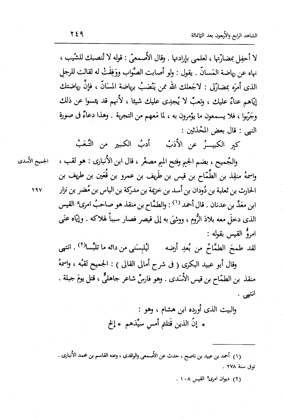 وَقَالَ أَبُو عبيد الْبكْرِيّ فِي شرح أمالي القالي: الجميح لقبه واسْمه منقذ بن الطماح بن قيس الْأَسدي. وَهُوَ فَارس شَاعِر جاهلي قتل يَوْم جبلة. انْتهى.