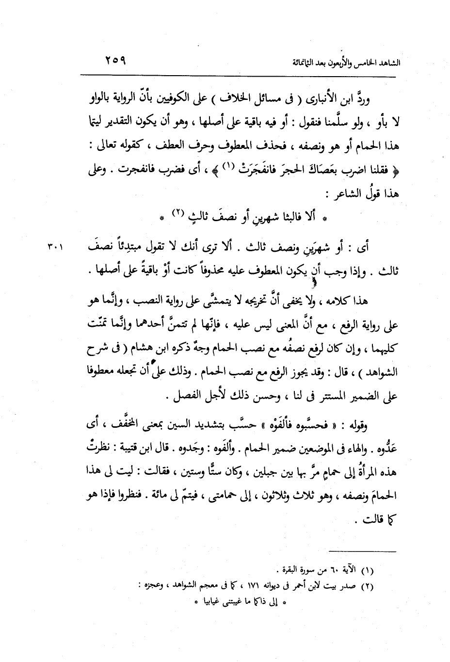 وَلَا يخفى أَن تَخْرِيجه لَا يتمشى على رِوَايَة النصب وَإِنَّمَا هُوَ على رِوَايَة الرّفْع مَعَ أَن الْمَعْنى لَيْسَ عَلَيْهِ فَإِنَّهَا لم تتمن أَحدهمَا وَإِنَّمَا تمنت كليهمَا وَإِن كَانَ لرفع نصفه مَه نصب الْحمام وَجه ذكره ابْن هِشَام فِي شرح الشواهد قَالَ: وَقد يجوز الرّفْع مَعَ نصب الْحمام. وَذَلِكَ على أَن تَجْعَلهُ مَعْطُوفًا على الضَّمِير الْمُسْتَتر فِي لنا وَحسن ذَلِك لأجل الْفَصْل.
