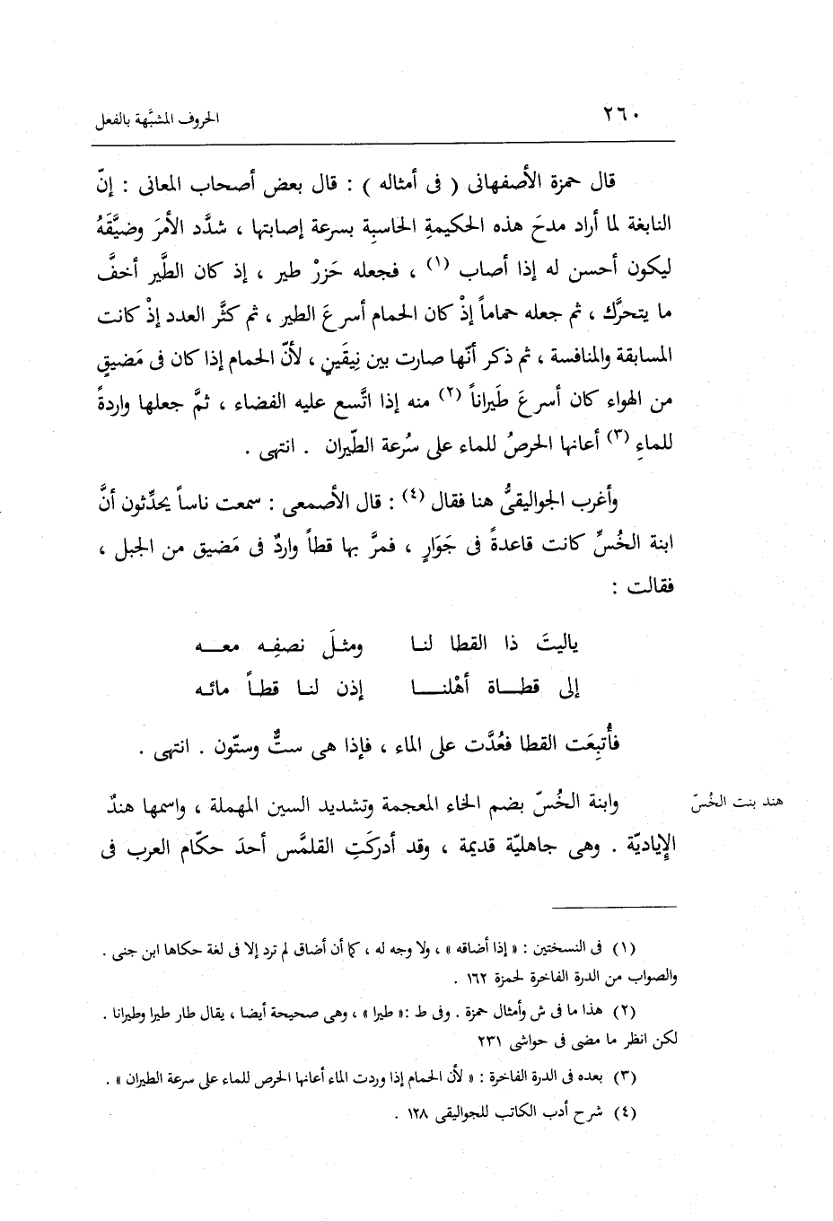 قَالَ حَمْزَة الْأَصْفَهَانِي فِي أَمْثَاله: قَالَ بعض أَصْحَاب الْمعَانِي: إِن النَّابِغَة لما أَرَادَ مدح هَذِه الحكيمة الحاسبة بِسُرْعَة إصابتها شدد الْأَمر وضيقه ليَكُون أحسن لَهُ إِذا أصَاب فَجعله حزر طير إِذْ كَانَ الطير أخف مَا يَتَحَرَّك ثمَّ جعله حَماما إِذْ كَانَ الْحمام أسْرع الطير ثمَّ كثر الْعدَد إِذْ كَانَت الْمُسَابقَة والمنافسة ثمَّ ذكر أَنَّهَا صَارَت بَين نيقين لِأَن الْحمام إِذا كَانَ فِي مضيق من الْهَوَاء كَانَ أسْرع طيراناً مِنْهُ إِذا اتَّسع عَلَيْهِ الفضاء ثمَّ جعلهَا وَارِدَة للْمَاء لِأَن الْحمام إِذا وَردت المَاء أعانها الْحِرْص للْمَاء على سرعَة الطيران. انْتهى.