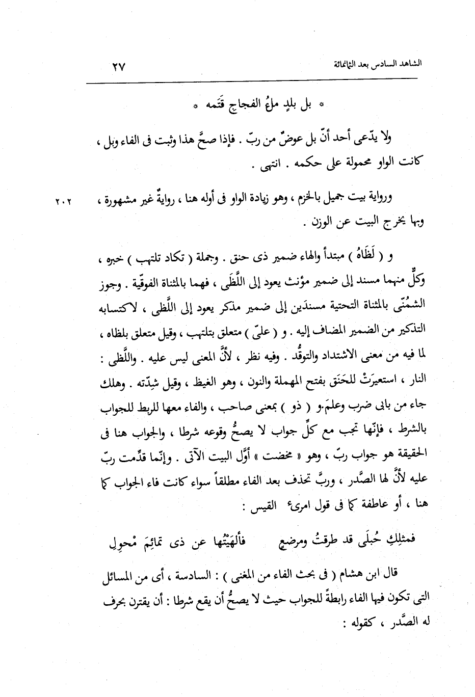 بل بلد ملْء الفجاج قتمه وَلَا يَدعِي أحد أَن بل عوض من رب. فَإِذا صَحَّ هَذَا وَثَبت فِي الْفَاء وبل كَانَت الْوَاو مَحْمُولَة على حكمه. انْتهى.