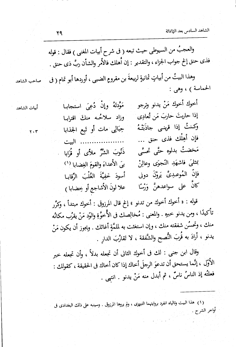 قَوْله: أَخُوك أَخُوك من تَدْنُو ... إِلَخ قَالَ المرزوقي: أَخُوك مُبْتَدأ وَكرر تَأْكِيدًا وَمن يدنو وَالْمعْنَى: مخالصك فِي الْأُخوة والود من يقرب مَكَانَهُ مِنْك وتحسن شفقته مِنْك وَإِن استغثت بِهِ لملمة أغاثك. وَيجوز أَن يكون من يدنو أَرَادَ بِهِ قرب النصح والشفقة لَا تقَارب الدَّار.
