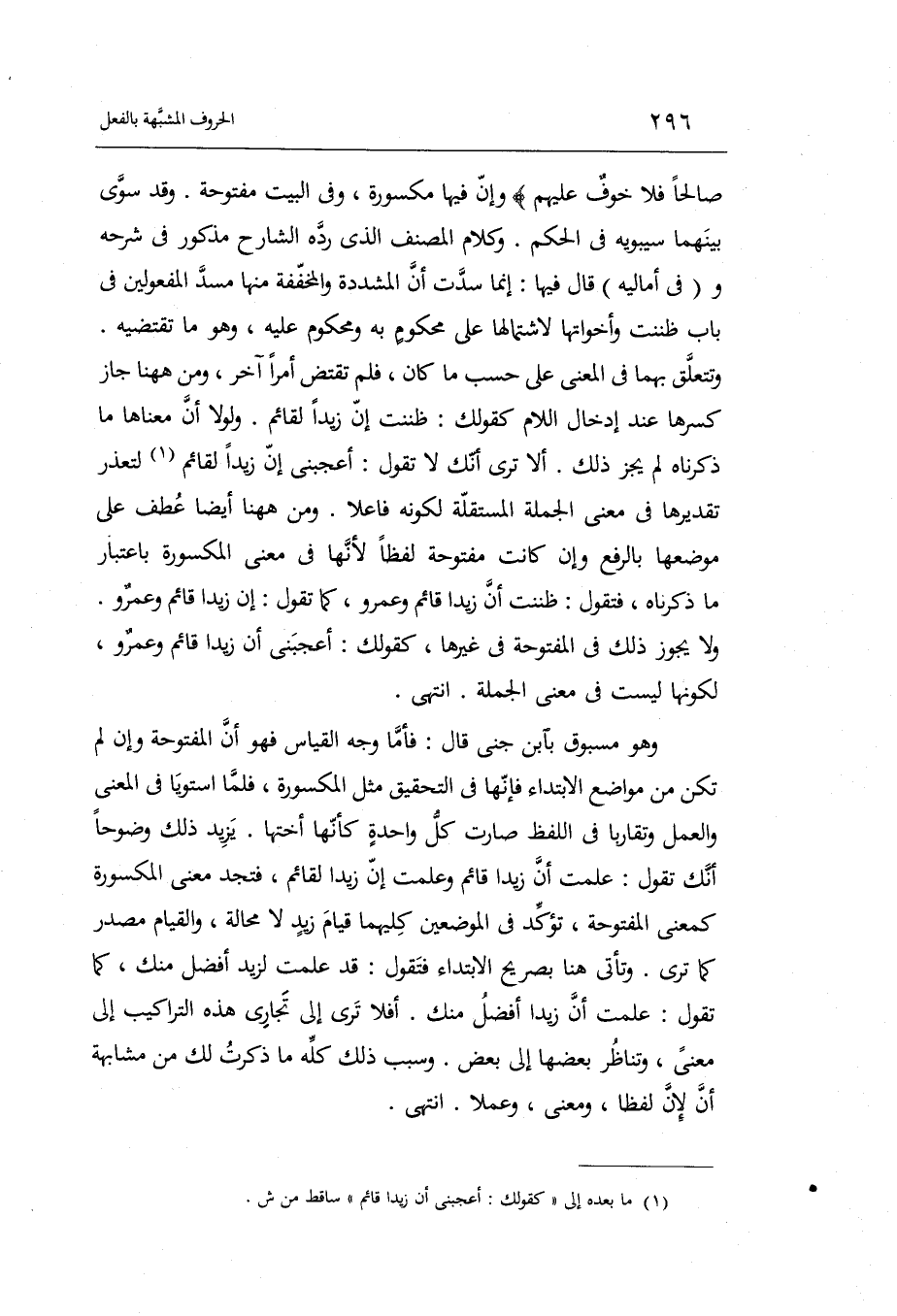 يزِيد ذَلِك وضوحاً أَنَّك تَقول: علمت أَن زيدا قَائِم وَعلمت إِن زيدا لقائم فتجد معنى الْمَكْسُورَة كمعنى الْمَفْتُوحَة تؤكد فِي الْمَوْضِعَيْنِ كليهمَا قيام زيد لَا محَالة وَالْقِيَام مصدر كَمَا ترى.