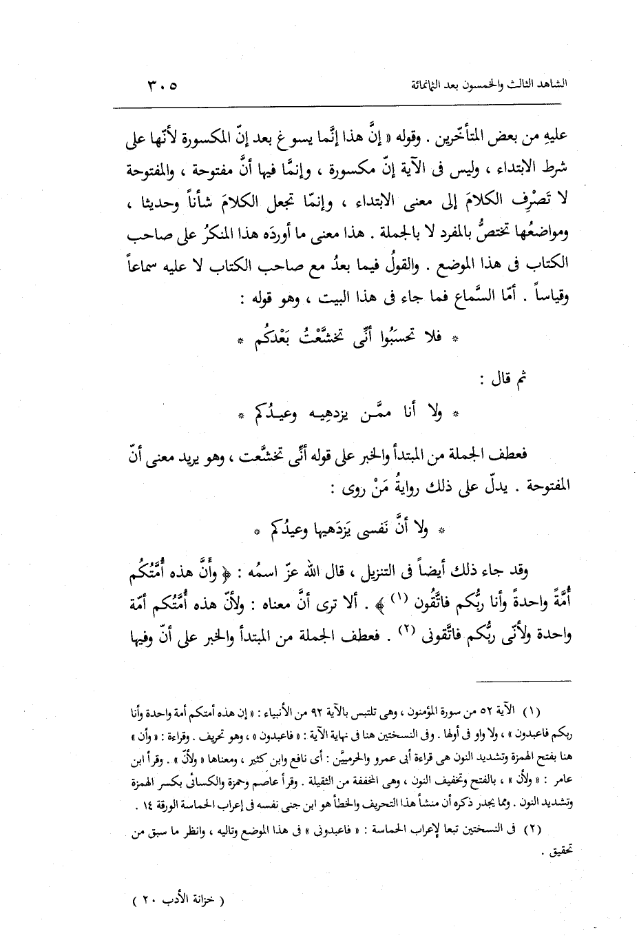 ثمَّ قَالَ: وَلَا أَنا مِمَّن يزدهيه وعيدكم فعطف الْجُمْلَة من الْمُبْتَدَأ وَالْخَبَر على قَوْله: أَنِّي تخشعت وَهُوَ يُرِيد معنى أَن الْمَفْتُوحَة. يدل على ذَلِك رِوَايَة من روى: وَلَا أَن نَفسِي يزدهيها وعيكم وَقد جَاءَ ذَلِك أَيْضا فِي التَّنْزِيل قَالَ الله عز اسْمه: وَأَن هَذِه أمتكُم أمة وَاحِدَة وَأَنا ربكُم فاتقوني. فعطف الْجُمْلَة من الْمُبْتَدَأ وَالْخَبَر على أَن وفيهَا