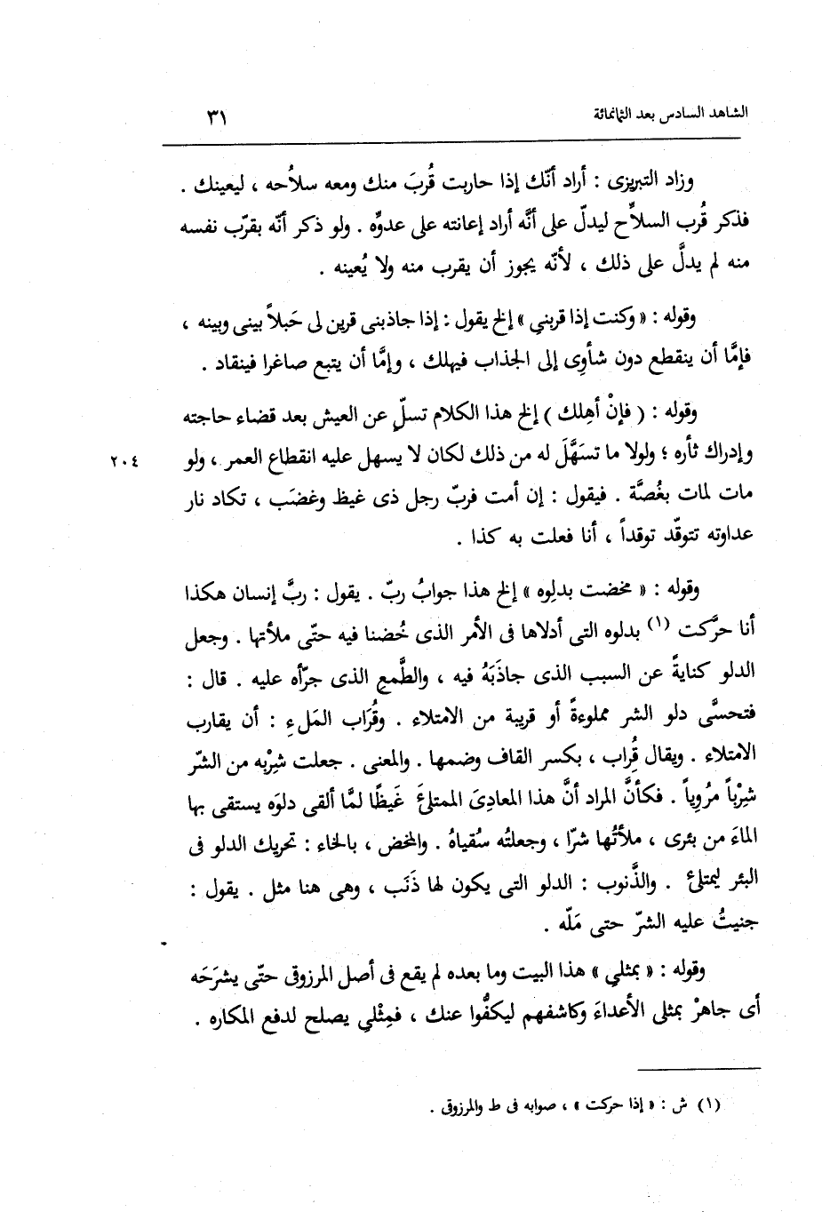 وَقَوله: وَكنت إِذا قريني ... إِلَخ يَقُول: إِذا جاذبني قرين لي حبلاً بيني وَبَينه فإمَّا أَن يَنْقَطِع دون شأوي إِلَى الجذاب فَيهْلك وَإِمَّا أَن يتبع صاغراً فينقاد.