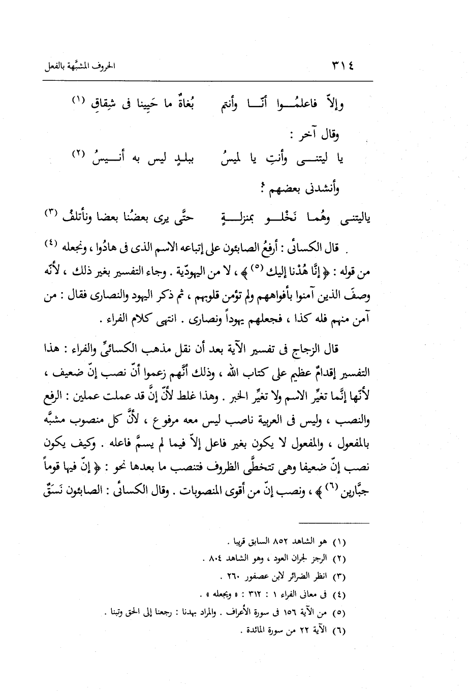 قَالَ الزّجاج فِي تَفْسِير الْآيَة بعد أَن نقل مَذْهَب الْكسَائي وَالْفراء: هَذَا التَّفْسِير إقدام عَظِيم على كتاب الله وَذَلِكَ أَنهم زَعَمُوا أَن نصب إِن ضَعِيف لِأَنَّهَا إِنَّمَا تغير الِاسْم وَلَا تغير الْخَبَر.