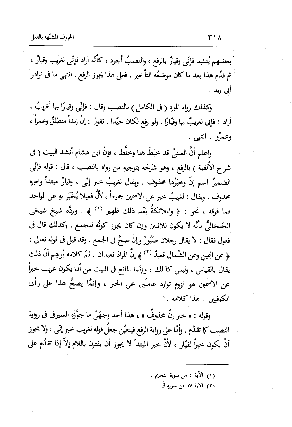 وَاعْلَم أَن الْعَيْنِيّ قد خبط هُنَا وخلط فَإِن ابْن هِشَام أنْشد الْبَيْت فِي شرح الألفية بِالرَّفْع وَهُوَ قَوْله: فَإِنِّي الضَّمِير اسْم إِن وخبرها مَحْذُوف. وَيُقَال لغريب خبر إِنِّي وقيار مُبْتَدأ وَخَبره مَحْذُوف. وَيُقَال: لغريب خبر عَن الاسمين جَمِيعًا لِأَن فعيلاً يخبر بِهِ عَن الْوَاحِد فَمَا فَوْقه نَحْو: وَالْمَلَائِكَة بعد ذَلِك ظهير.