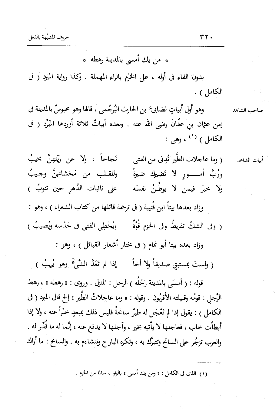 من يَك أَمْسَى بِالْمَدِينَةِ رهطه بِدُونِ الْفَاء فِي أَوله على الخرم بالراء الْمُهْملَة. وَكَذَا رِوَايَة الْمبرد فِي الْكَامِل. وَهُوَ أول أَبْيَات)