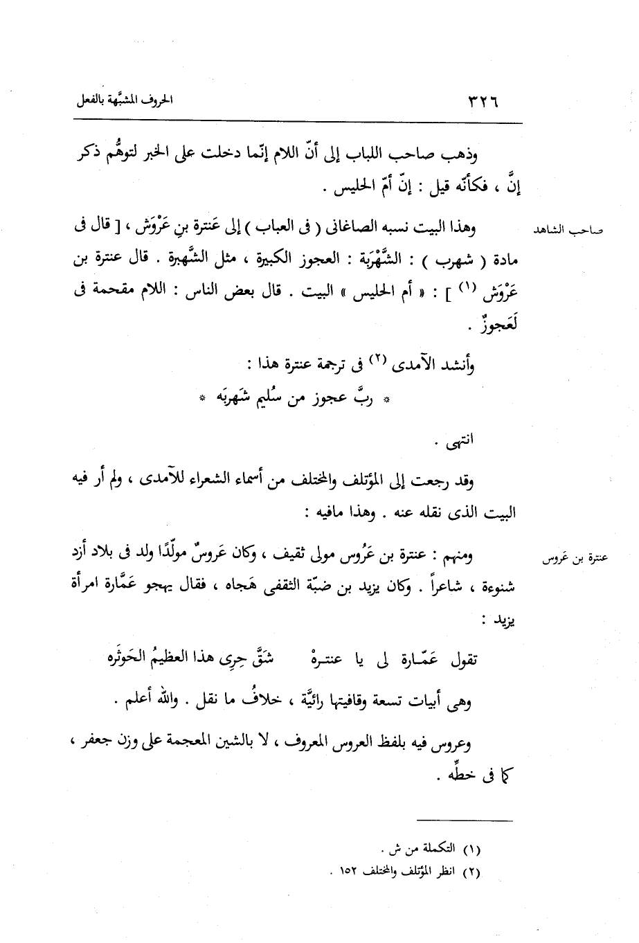 وَقد رجعت إِلَى المؤتلف والمختلف من أَسمَاء الشُّعَرَاء للآمدي وَلم أر فِيهِ الْبَيْت الَّذِي نَقله عَنهُ. وَهَذَا مَا فِيهِ: وَمِنْهُم: عنترة بن عروس مولى ثفيف وَكَانَ عروس مولداً ولد فِي بِلَاد أَزْد شنُوءَة شَاعِرًا.