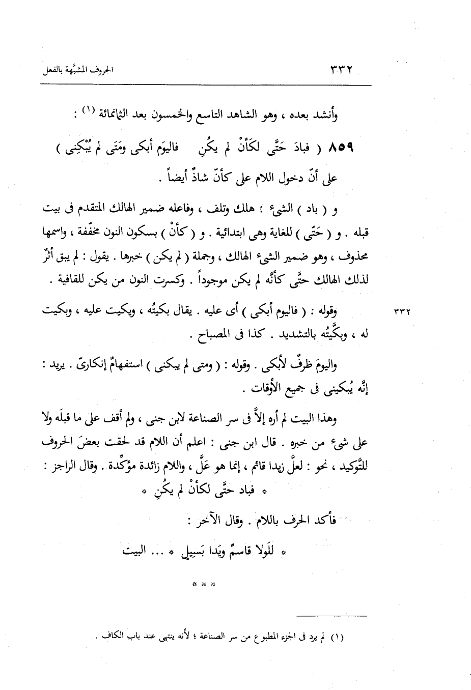 على أَن دُخُول اللَّام على كَأَن شَاذ أَيْضا. وباد الشَّيْء: هلك وَتلف وفاعله ضمير الْهَالِك الْمُتَقَدّم فِي بَيت قبله. وحَتَّى للغاية وَهِي ابتدائية. وكَأَن بِسُكُون النُّون مُخَفّفَة وَاسْمهَا مَحْذُوف وَهُوَ ضمير الشَّيْء الْهَالِك وَجُمْلَة لم يكن: خَبَرهَا.