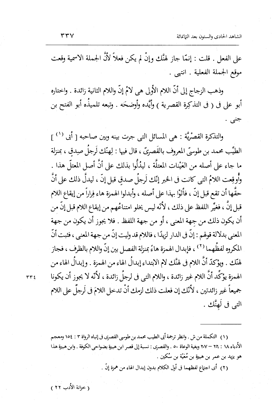 والتذكرة القصرية: هِيَ الْمسَائِل الَّتِي جرت بَينه وَبَين صَاحبه أبي الطّيب مُحَمَّد بن طوسي الْمَعْرُوف بالقصري قَالَ فِيهَا: لهنك لرجل صدق بِمَنْزِلَة مَا جَاءَ على أَصله من العينات المعتلة أوقعت اللَّام الَّتِي كَانَت فِي الْخَبَر إِنَّك لرجل صدق قبل إِن ليدل ذَلِك على أَن حَقّهَا أَن تقع قبل إِن فَأتوا بِهَذَا على أَصله وأبدلوا الْهمزَة هَاء فِرَارًا من إِيقَاع اللَّام قبل إِن فَغير اللَّفْظ على ذَلِك لِأَنَّهُ لَيْسَ يَخْلُو امتناعهم من إِيقَاع اللَّام قبل إِن من أَن يكون ذَلِك من جِهَة الْمَعْنى أَو من جِهَة اللَّفْظ.