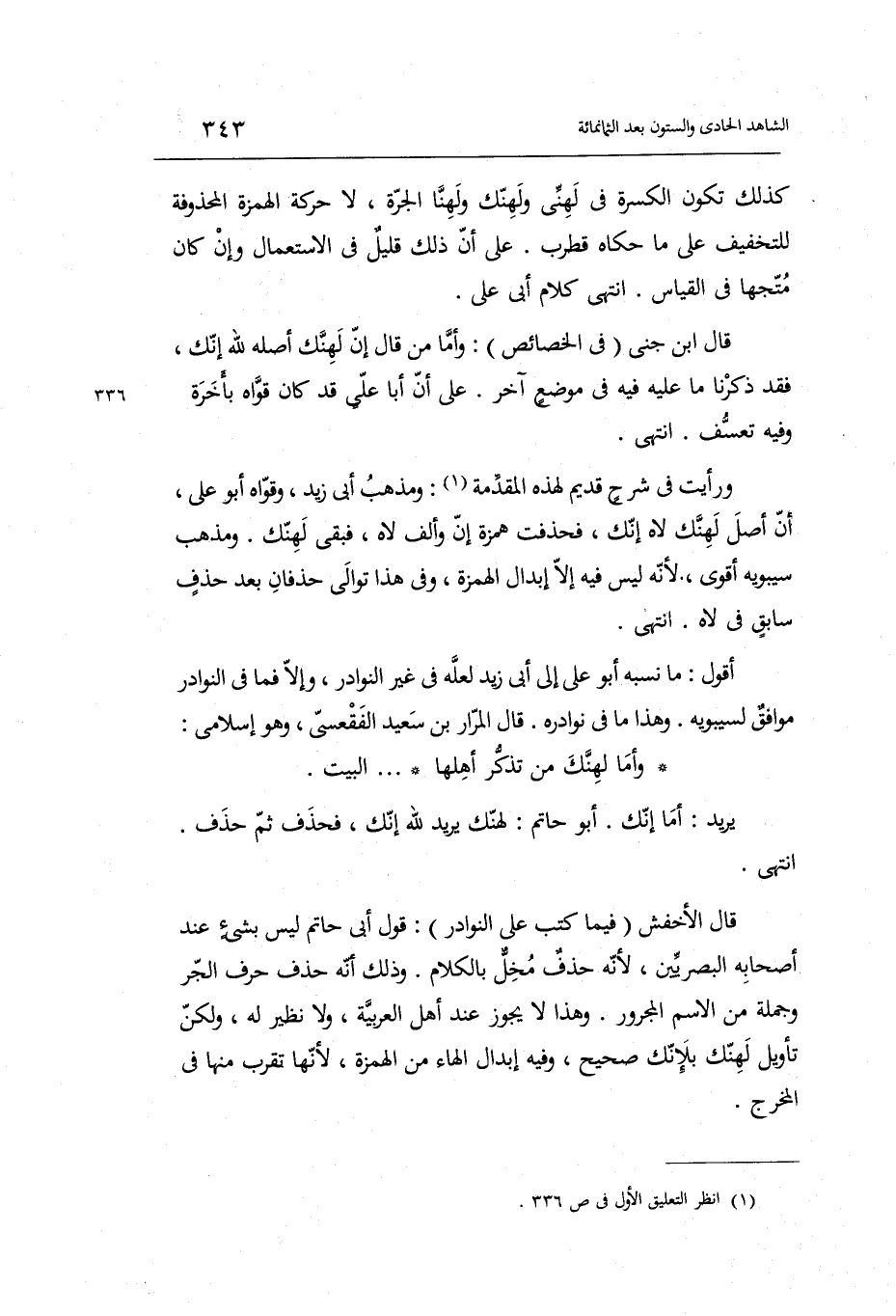 وَرَأَيْت فِي شرح قديم لهَذِهِ الْمُقدمَة: وَمذهب أبي زيد وَقواهُ أَبُو عَليّ أَن أصل لهنك لاه إِنَّك فحذفت همزَة إِن وَألف لاه فَبَقيَ لهنك.