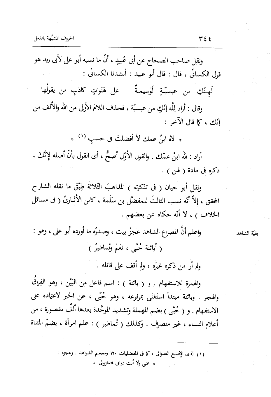 وَقَالَ: أَرَادَ لله إِنَّك من عبسية فَحذف اللَّام الأولى من الله وَالْألف من إِنَّك كَمَا قَالَ الآخر: لاه ابْن عمك لَا أفضلت فِي حسب أَرَادَ: لله ابْن عمك. وَالْقَوْل الأول أصح أَي: القَوْل بِأَن أَصله لإنك ذكره مَادَّة لَهُنَّ.