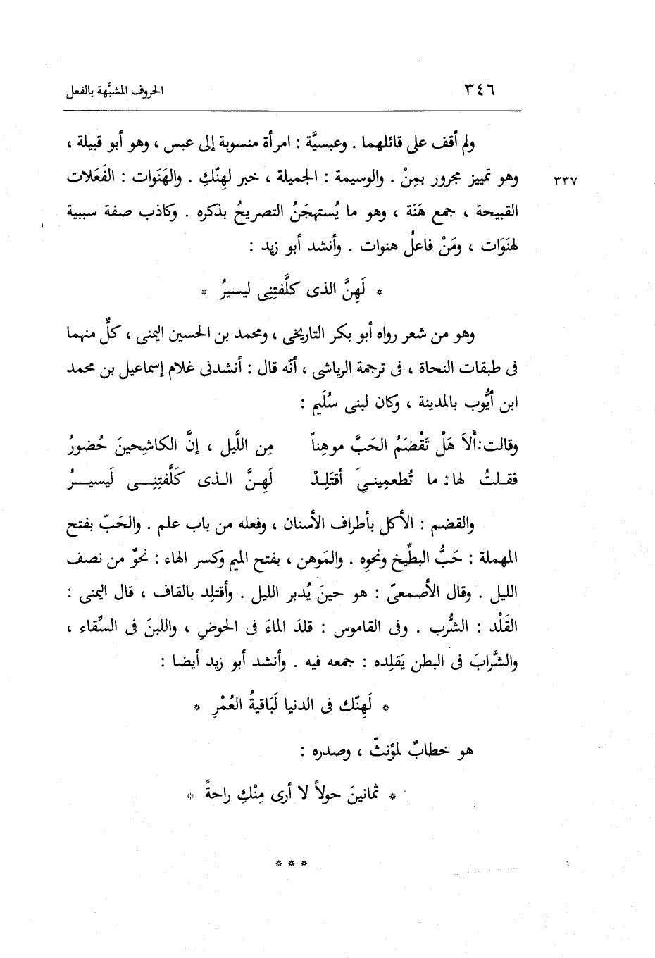 وَأنْشد أَبُو زيد أَيْضا: لهنك فِي الدُّنْيَا لباقية الْعُمر هُوَ خطاب لمؤنث وصدره: ثَمَانِينَ حولا لَا أرى مِنْك رَاحَة