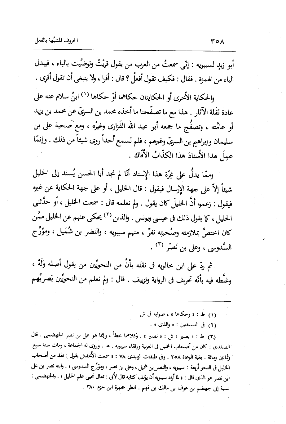 وَمِمَّا يدل على غرَّة هَذَا الْإِسْنَاد أَنا لم نجد أَبَا الْحسن يسند إِلَى الْخَلِيل شَيْئا إِلَّا على جِهَة الْإِرْسَال فَيَقُول: قَالَ الْخَلِيل أَو على جِهَة الْحِكَايَة عَن غَيره فَيَقُول: زَعَمُوا أَن الْخَلِيل كَانَ يَقُول.