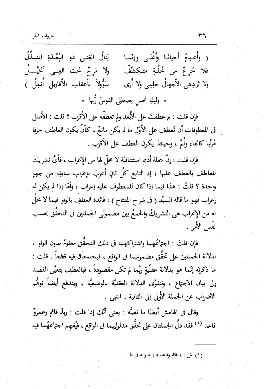 وَلَيْلَة نحس يصطلي الْقوس رَبهَا فَإِن قلت: لم عطفت على الْأَبْعَد وَلم تعطفه على الْأَقْرَب قلت: الأَصْل فِي المعطوفات أَن تعطف على الأول مَا لم يكن مَانع كَأَن يكون العاطف حرفا مُرَتبا كالفاء وَثمّ وَحِينَئِذٍ يكون الْعَطف على الْأَقْرَب.
