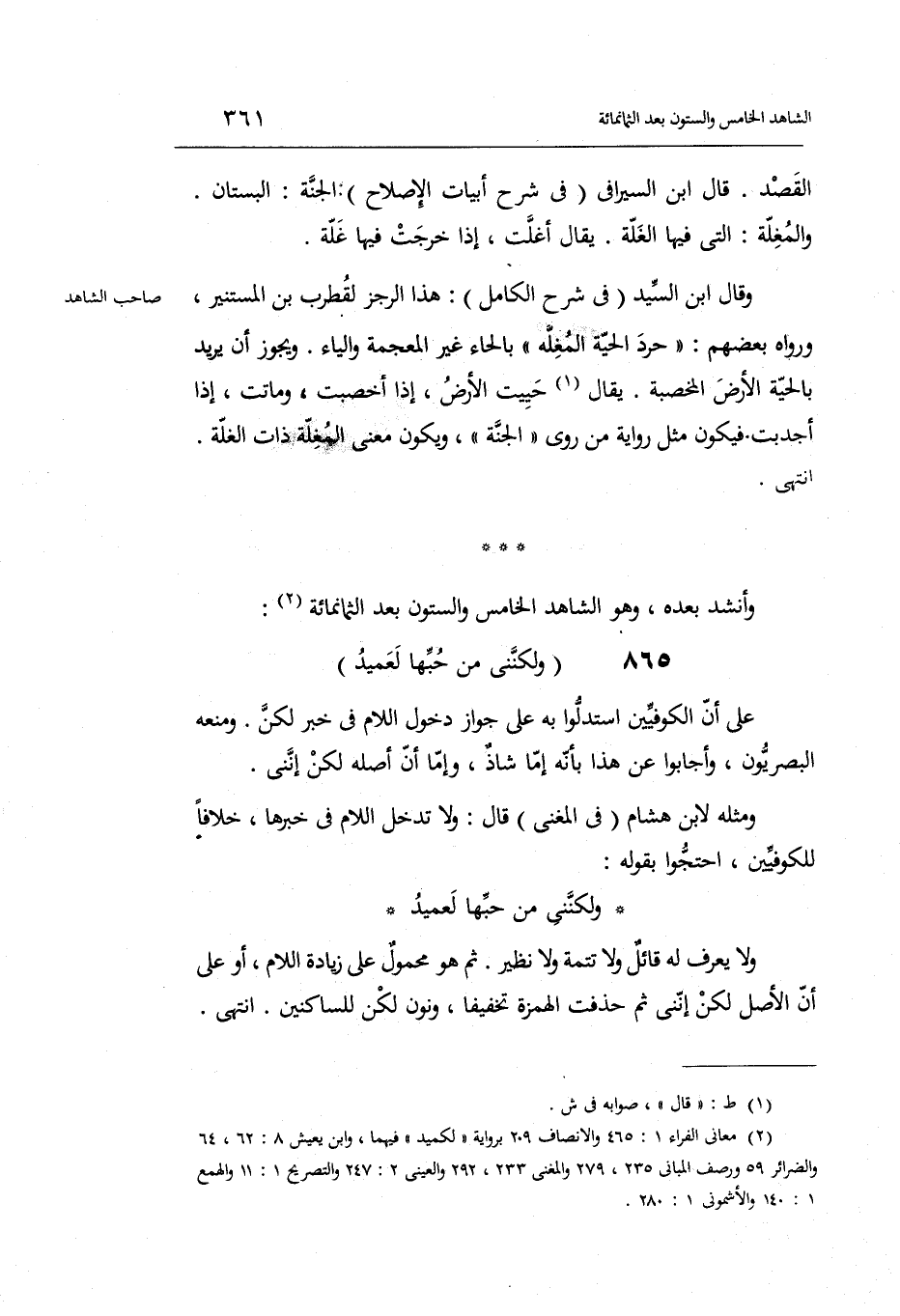 ولكنني من حبها لعميد على أَن الْكُوفِيّين استدلوا بِهِ على جَوَاز دُخُول اللَّام فِي خبر لَكِن. وَمنعه البصريون وَأَجَابُوا عَن هَذَا بِأَنَّهُ: إِمَّا شَاذ وَإِمَّا أَن أَصله لَكِن إِنَّنِي.