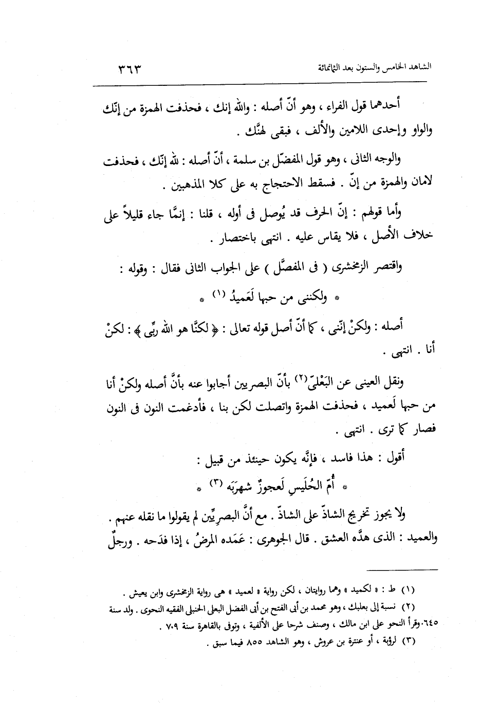 وَنقل الْعَيْنِيّ عَن البعلي بِأَن الْبَصرِيين أجابوا عَنهُ بِأَن أَصله وَلَكِن أَنا من حبها لعميد فحذفت أَقُول: هَذَا فَاسد فَإِنَّهُ يكون حِينَئِذٍ من قبيل: أم الْحُلَيْس لعجوز شهربه وَلَا يجوز تَخْرِيج الشاذ على الشاذ. مَعَ أَن الْبَصرِيين لم يَقُولُوا مَا نَقله عَنْهُم. والعميد: الَّذِي هده الْعِشْق. قَالَ الْجَوْهَرِي: عمده الْمَرَض إِذا فدحه. وَرجل