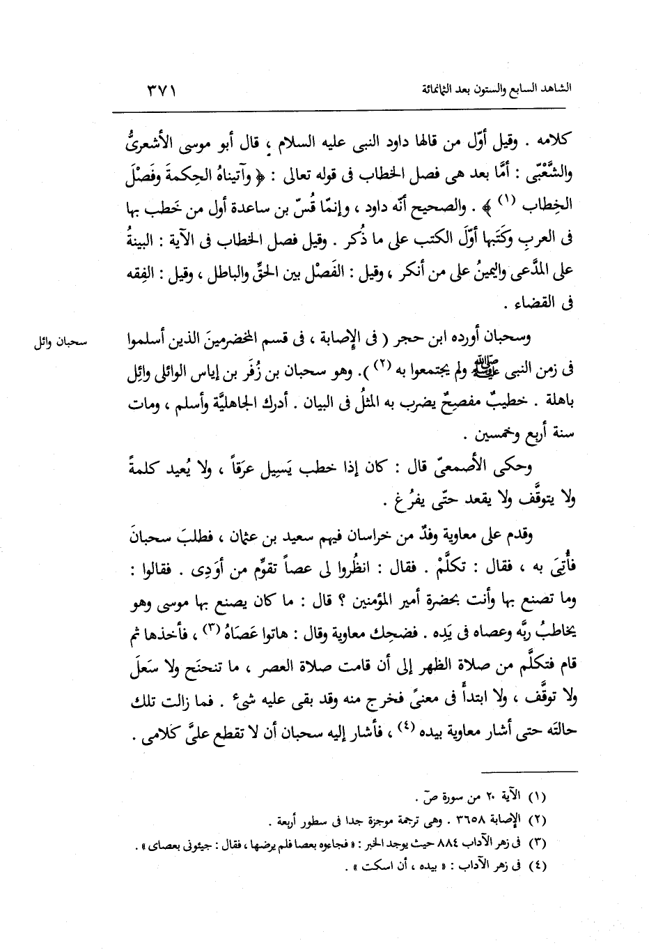 فَمَا زَالَت تِلْكَ حَالَته حَتَّى أَشَارَ مُعَاوِيَة بِيَدِهِ فَأَشَارَ إِلَيْهِ سحبان أَن لَا تقطع عَليّ كَلَامي.