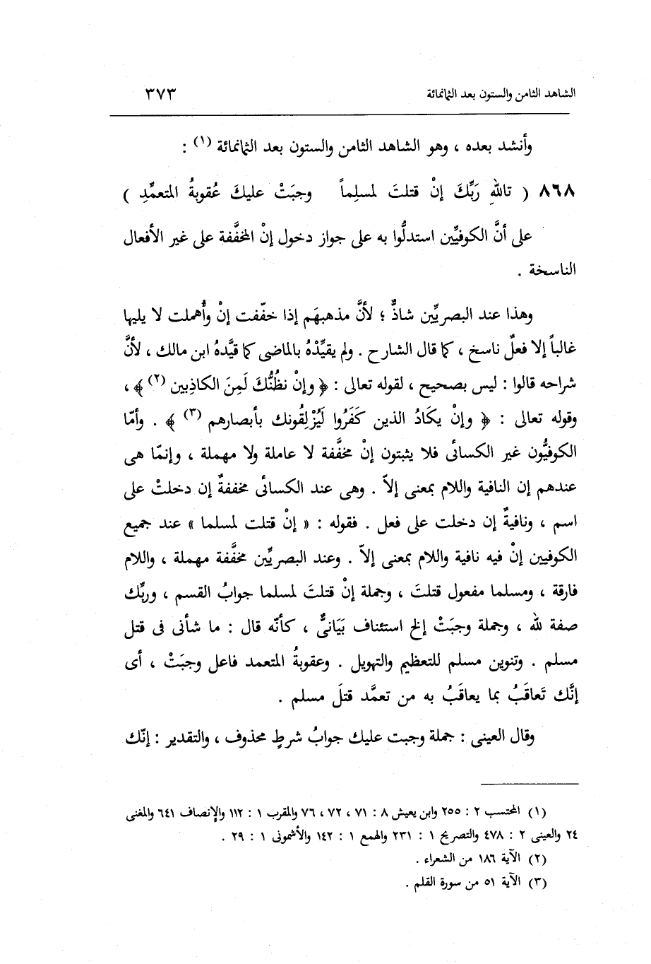 وَعند الْبَصرِيين مُخَفّفَة مُهْملَة وَاللَّام فارقة وَمُسلمًا: مفعول قتلت وَجُمْلَة إِن قتلت لمسلماً: جَوَاب الْقسم ورَبك: صفة لله وَجُمْلَة وَجَبت ... إِلَخ اسْتِئْنَاف بياني كَأَنَّهُ قَالَ: مَا شأني فِي قتل مُسلم. وتنوين مُسلم للتعظيم والتهويل. وعقوبة الْمُتَعَمد فَاعل وَجَبت أَي: إِنَّك تعاقب بِمَا يُعَاقب بِهِ من تعمد قتل مُسلم.