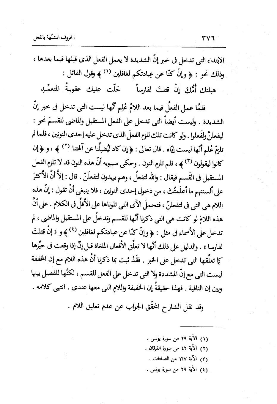 وَالدَّلِيل على ذَلِك أَنَّهَا لَا تعلق الْأَفْعَال الملغاة قبل إِن إِذا وَقعت فِي حيزها كَمَا تعلقهَا الَّتِي تدخل على الْخَبَر. فقد ثَبت بِمَا ذكرنَا أَن هَذِه اللَّام مَعَ إِن المخففة لَيست الَّتِي مَعَ إِن الْمُشَدّدَة وَلَا الَّتِي تدخل على الْفِعْل للقسم لَكِنَّهَا للفصل بَينهَا وَبَين إِن النافية. فَهَذَا حَقِيقَة إِن الْخَفِيفَة وَاللَّام الَّتِي مَعهَا عِنْدِي. انْتهى كَلَامه.