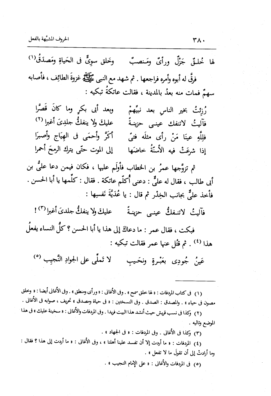 ثمَّ تزَوجهَا عمر بن الْخطاب فأولم عَلَيْهَا فَكَانَ فِيمَن دَعَا عَليّ بن أبي طَالب رَضِي الله تَعَالَى عَنْهُمَا فَقَالَ لَهُ عَليّ: دَعْنِي أكلم عَاتِكَة. فَقَالَ: كلمها يَا أَبَا الْحسن فَأخذ عَليّ بِجَانِب الخدر ثمَّ قَالَ: يَا عدية نَفسهَا:)