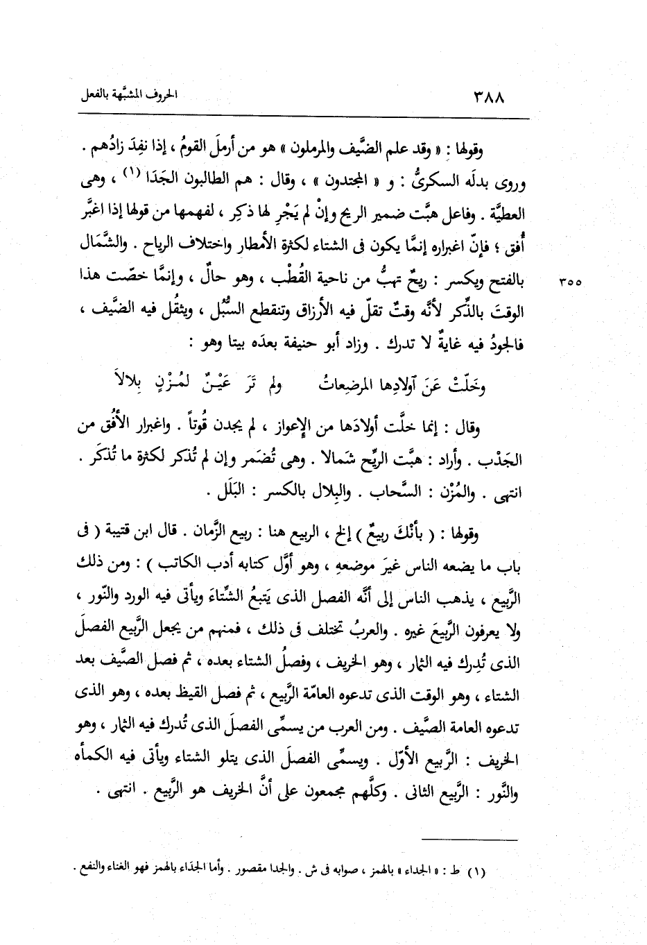 وَمن الْعَرَب من يُسَمِّي الْفَصْل الَّذِي تدْرك فِيهِ الثِّمَار وَهُوَ الخريف: الرّبيع الأول. ويسمي الْفَصْل الَّذِي يتلوه الشتَاء وَيَأْتِي فِيهِ الكمأة والنور: الرّبيع الثَّانِي. وَكلهمْ مجمعون على أَن الخريف هُوَ الرّبيع. انْتهى.
