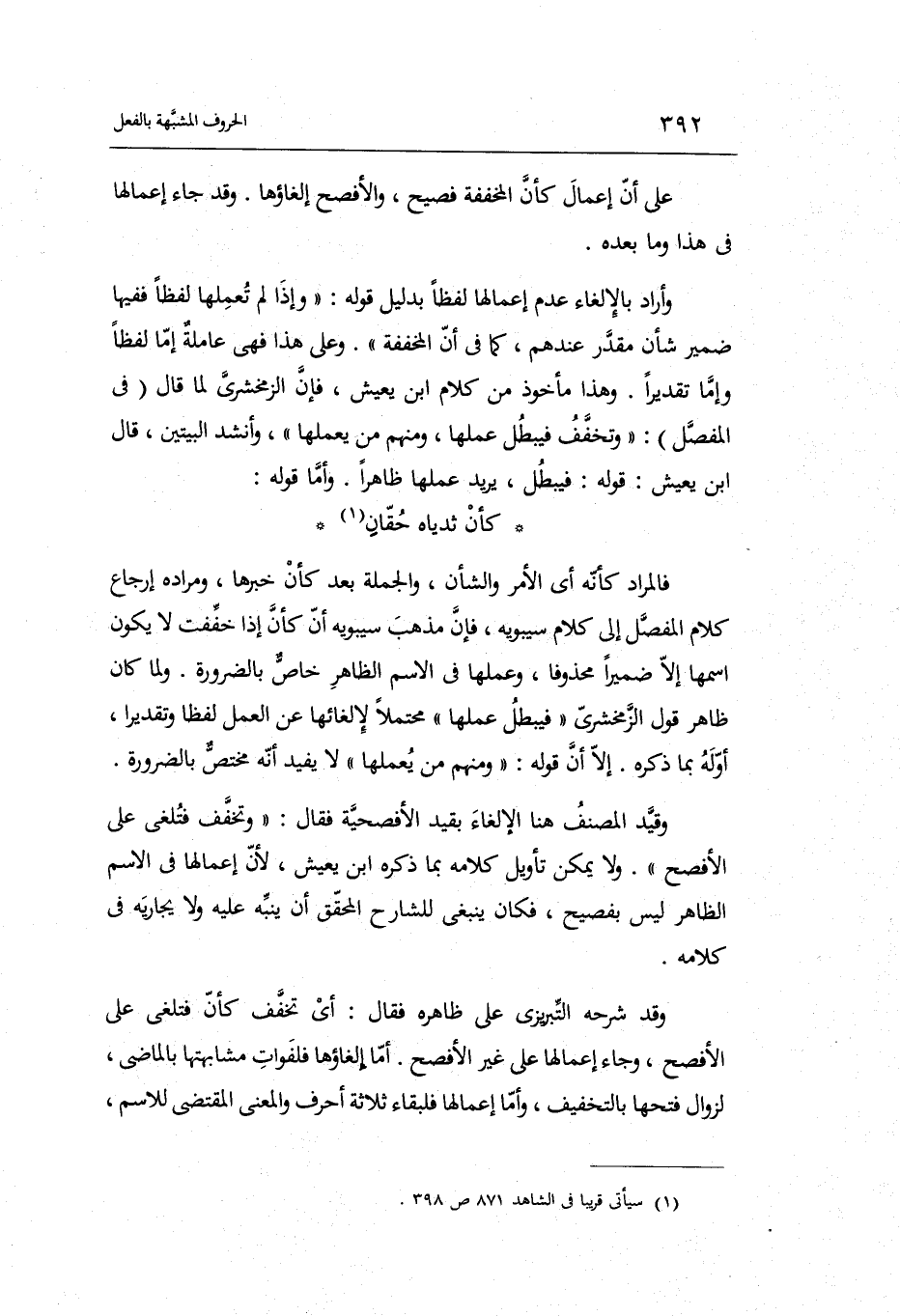 وَقد شَرحه التبريزي على ظَاهره فَقَالَ: أَي: تخفف كَأَن فتلغى على الْأَفْصَح وَجَاء إعمالها على غير الْأَفْصَح. د أما إلغاؤها فلفوات مشابهتها بالماضي لزوَال فتحهَا بِالتَّخْفِيفِ وَأما إعمالها فلبقاء ثَلَاثَة أحرف وَالْمعْنَى الْمُقْتَضى للاسم