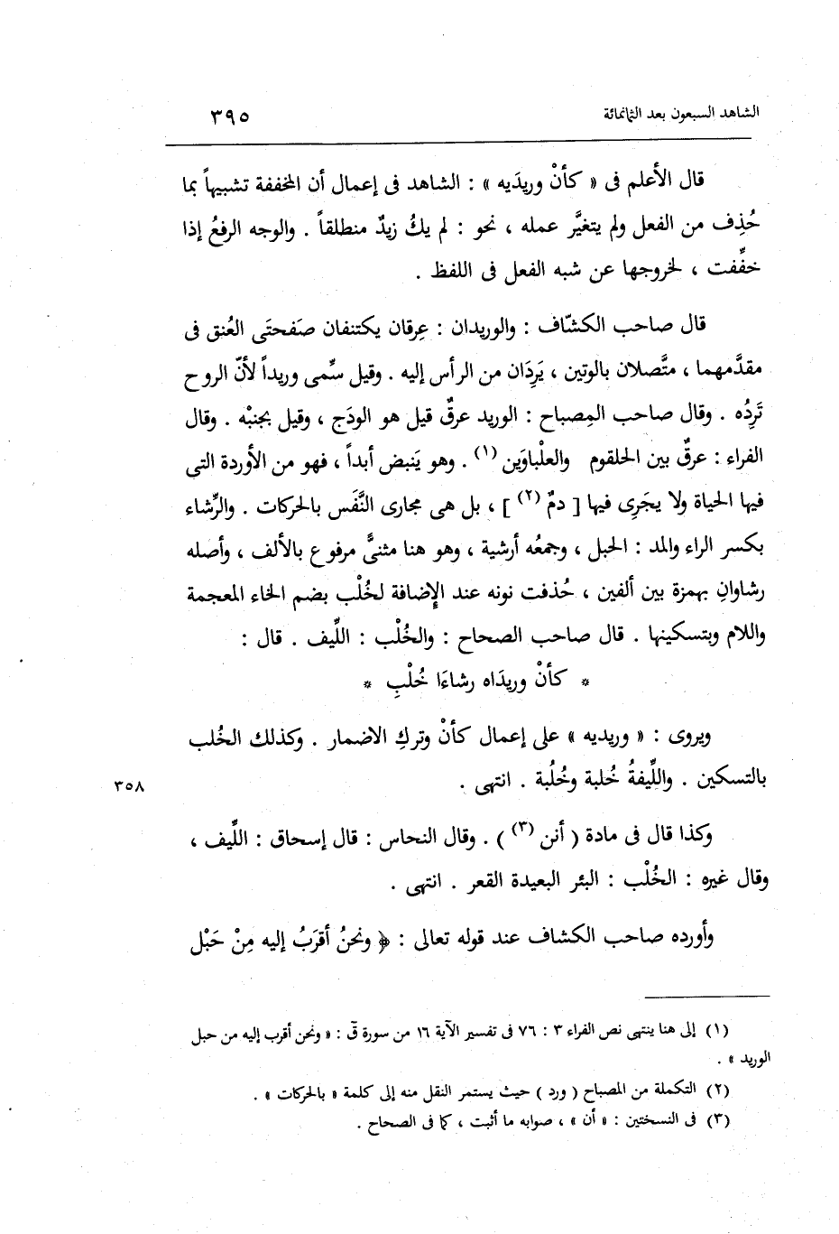 قَالَ الأعلم فِي كَأَن وريديه: الشَّاهِد فِي إِعْمَال أَن المخففة تَشْبِيها بِمَا حذف من الْفِعْل وَلم يتَغَيَّر عمله نَحْو: لم يَك زيد مُنْطَلقًا. وَالْوَجْه الرّفْع إِذا خففت لخروجها عَن شبه الْفِعْل فِي اللَّفْظ.