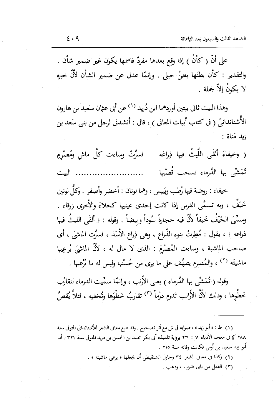 وَهَذَا الْبَيْت ثَانِي بَيْتَيْنِ أوردهما ابْن دُرَيْد عَن أبي عُثْمَان سعيد بن هَارُون الأشنانداني فِي كتاب أَبْيَات الْمعَانِي قَالَ: أَنْشدني لرجل من بني سعد بن زيد مَنَاة: