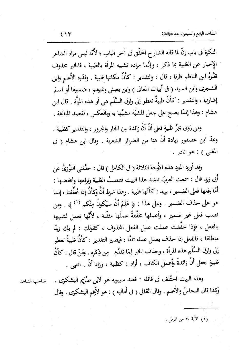 وَقدره الأعلم وَابْن الشجري وَابْن السَّيِّد فِي أَبْيَات الْمعَانِي وَابْن يعِيش وَغَيرهم ضميرها أَو اسْم إشارتها وَالتَّقْدِير: كَأَن ظَبْيَة تعطو إِلَى وارق السّلم هِيَ أَو هَذِه الْمَرْأَة. قَالَ ابْن هِشَام: وَهَذَا إِنَّمَا يَصح على جعل الْمُشبه مشبهاً بِهِ وَبِالْعَكْسِ لقصد الْمُبَالغَة.)
