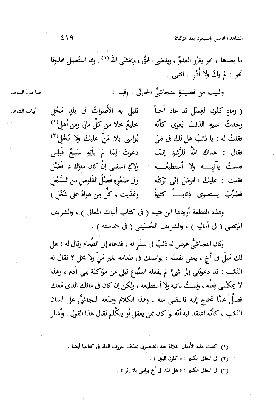 وَهَذَا الْكَلَام وَضعه النَّجَاشِيّ على لِسَان الذِّئْب كَأَنَّهُ اعْتقد فِيهِ أَنه لَو كَانَ مِمَّن يعقل أَو يتَكَلَّم لقَالَ هَذَا القَوْل. وَأَشَارَ