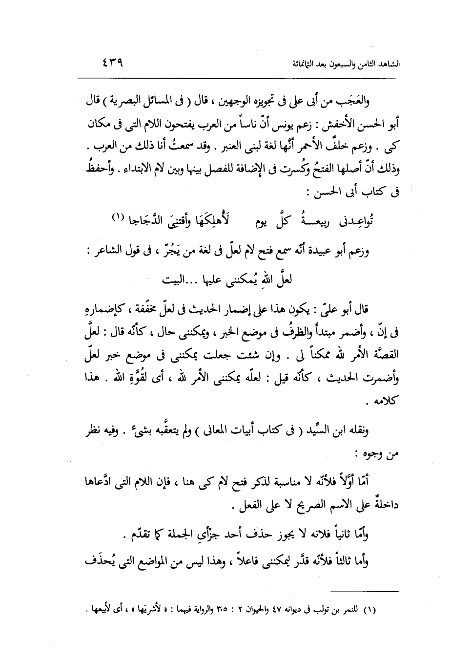وَالْعجب من أبي عَليّ فِي تجويزه الْوَجْهَيْنِ قَالَ فِي الْمسَائِل البصرية قَالَ: أَبُو الْحسن الْأَخْفَش: زعم يُونُس أَن نَاسا من الْعَرَب يفتحون اللَّام الَّتِي فِي مَكَان كي.