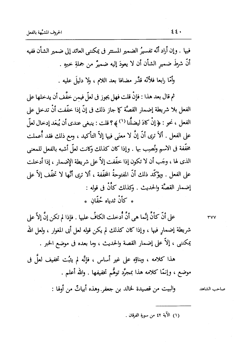وَإِذا كَانَ كَذَلِك وَكَانَت لَعَلَّ أشبه بِالْفِعْلِ للمعنى الَّذِي لَهَا وَجب أَن لَا تكون إِذا خففت إِلَّا على شريطة الْإِضْمَار إِذا أدخلت على الْفِعْل. ويؤكد ذَلِك أَن الْمَفْتُوحَة المخففة.