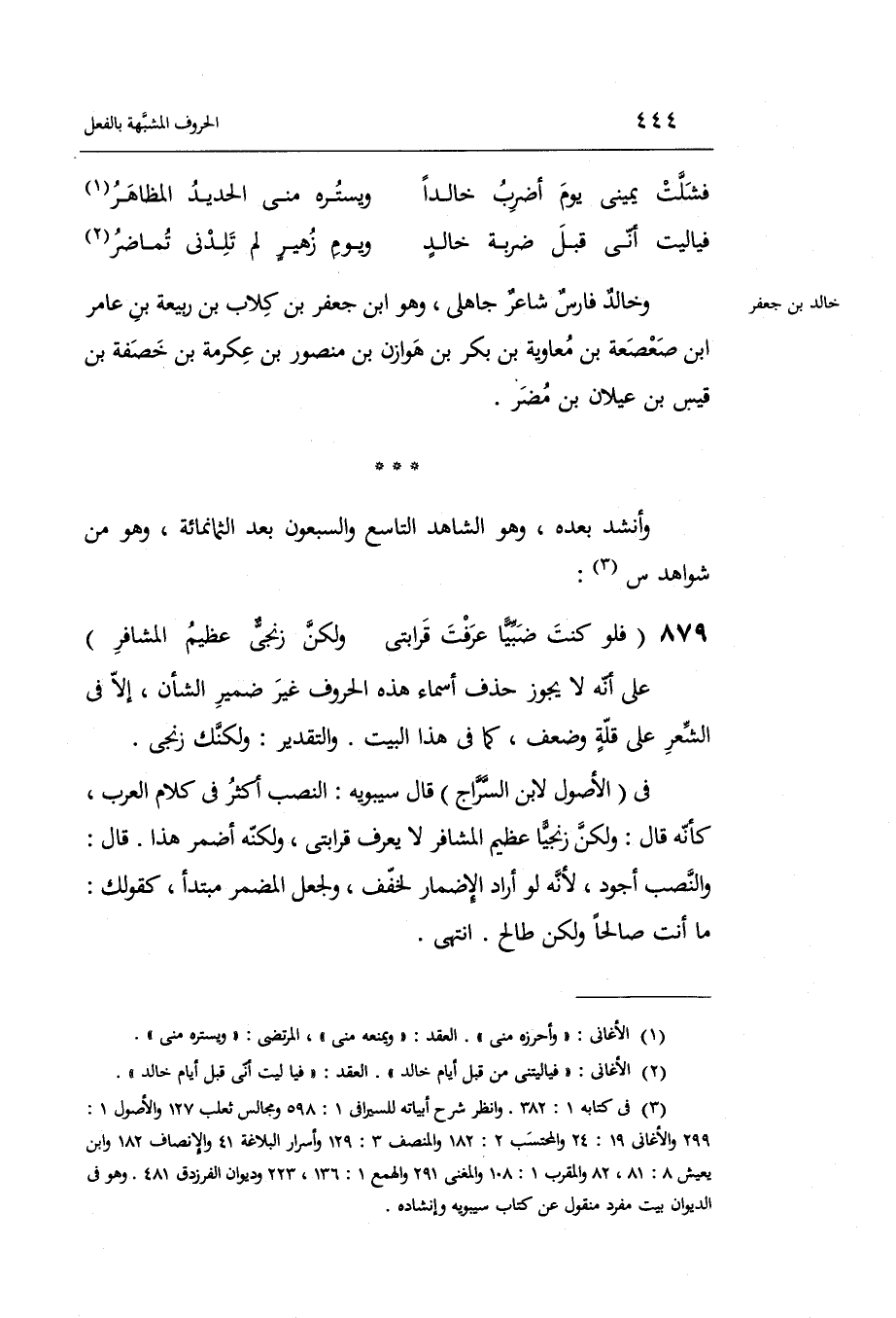 فِي الْأُصُول لِابْنِ السراج قَالَ سِيبَوَيْهٍ: النصب أَكثر فِي كَلَام الْعَرَب كَأَنَّهُ قَالَ: وَلَكِن زنجياً عَظِيم المشافر لَا يعرف قَرَابَتي وَلكنه أضمر هَذَا.