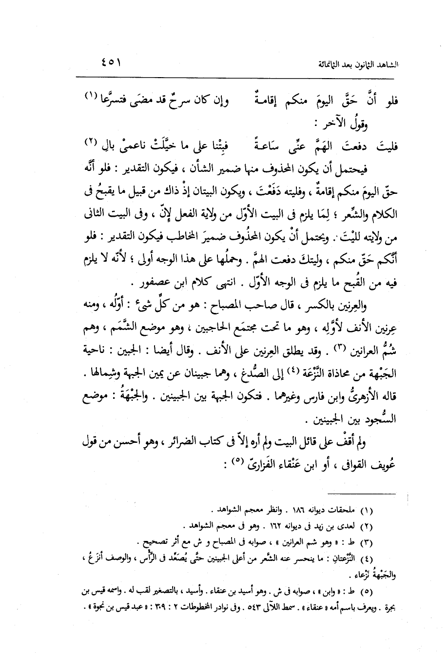 وَلم أَقف على قَائِل الْبَيْت وَلم أره إِلَّا فِي كتاب الضرائر وَهُوَ أحسن من قَول عويف القوافي أابْن عنقاء الْفَزارِيّ: ...