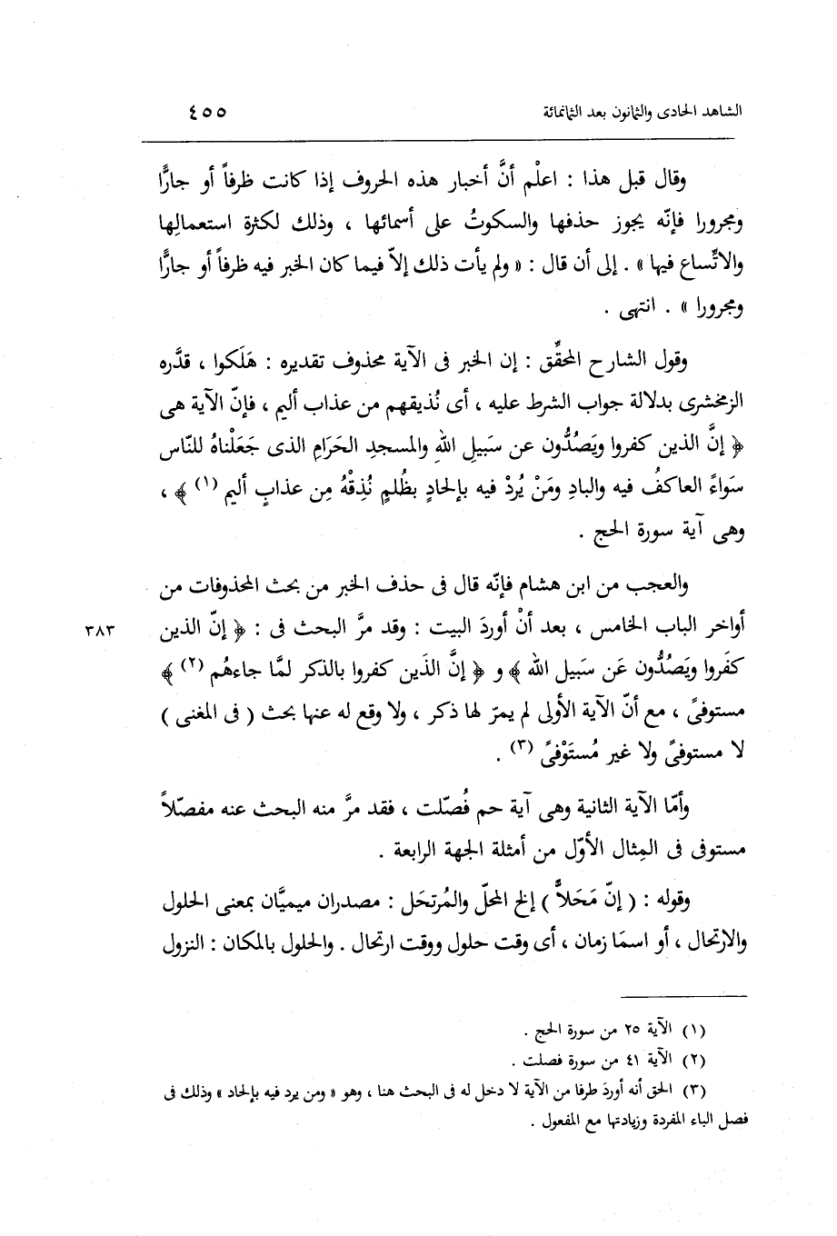 وَقَول الشَّارِح الْمُحَقق: إِن الْخَبَر فِي الْآيَة مَحْذُوف تَقْدِيره: هَلَكُوا قدره الزَّمَخْشَرِيّ بِدلَالَة جَوَاب الشَّرْط عَلَيْهِ أَي: نذيقهم من عَذَاب أَلِيم فَإِن الْآيَة هِيَ إِن الَّذين كفرُوا ويصدون عَن سَبِيل الله وَالْمَسْجِد الْحَرَام الَّذِي جَعَلْنَاهُ للنَّاس سَوَاء العاكف فِيهِ والباد وَمن يرد فِيهِ بإلحاد بظُلْم نذقه من عَذَاب أَلِيم وَهِي آيَة سُورَة الْحَج.