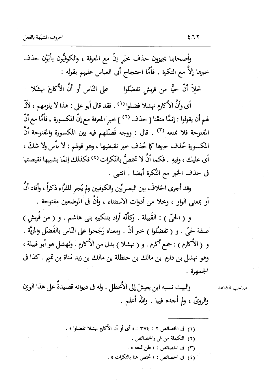 أَي: وَأَن الأكارم نَهْشَلَا فضلوا. فقد قَالَ أَبُو عَليّ: هَذَا لَا يلْزمهُم لِأَن لَهُم أَن يَقُولُوا: إِنَّمَا منعنَا حذف خبر الْمعرفَة مَعَ إِن الْمَكْسُورَة فَأَما مَعَ أَن الْمَفْتُوحَة فَلَا نمنعه.