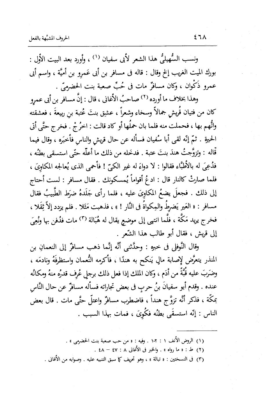وَهَذَا بِخِلَاف مَا أوردهُ صَاحب الأغاني قَالَ: إِن مُسَافر بن أبي عَمْرو كَانَ من فتيَان قُرَيْش جمالاً وسخاء وشعراً عشق بنت عتبَة بن ربيعَة فعشقته واتهم بهَا فَحملت مِنْهُ فَلَمَّا بَان حملهَا أَو كَاد قَالَت: اخْرُج. فَخرج حَتَّى أَتَى الْحيرَة. ثمَّ إِنَّه ألْقى أَبَا سُفْيَان فَسَأَلَهُ عَن حَال قُرَيْش وَالنَّاس فَأخْبرهُ وَقَالَ فِيمَا قَالَه: وَتَزَوَّجت عِنْد بنت عتبَة. فدخله من ذَلِك مَا أعله حَتَّى استسقى بَطْنه فدعي لَهُ بالأطباء فَقَالُوا: لَا دَوَاء لَهُ غير الكي فأحمى الَّذِي يعالجه المكاوي فَلَمَّا صَارَت كالنار قَالَ: ادْع أَقْوَامًا يمسكونك. فَقَالَ مُسَافر: لست أحتاج إِلَى ذَلِك.