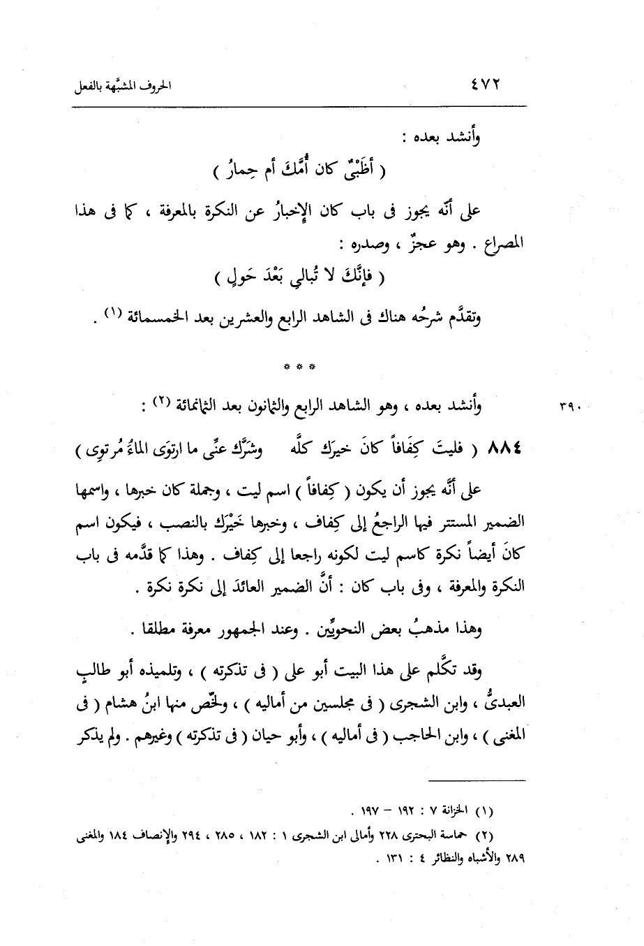 وَأنْشد بعده: أظبي كَانَ أمك أم حمَار على أَنه يجوز فِي بَاب كَانَ الْإِخْبَار عَن النكرَة بالمعرفة كَمَا فِي هَذَا المصراع. وَهُوَ عجز وصدره: فَإنَّك لَا تبالي بعد حول وَتقدم شَرحه هُنَاكَ فِي الشَّاهِد الرَّابِع وَالْعِشْرين بعد الْخَمْسمِائَةِ.)