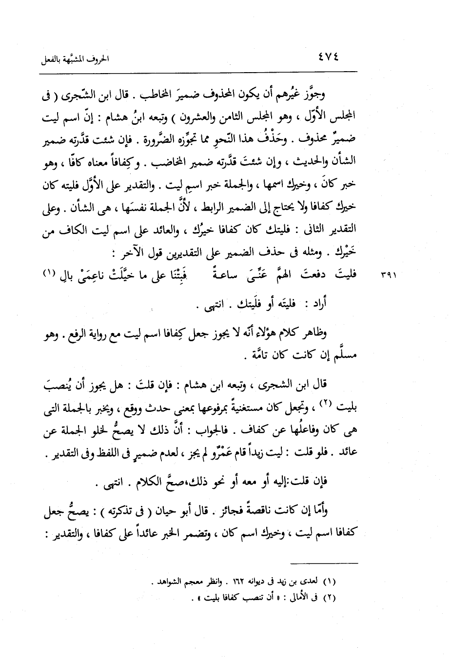 وَجوز غَيرهم أَن يكون الْمَحْذُوف ضمير الْمُخَاطب. قَالَ ابْن الشجري فِي الْمجْلس الأول وَهُوَ الْمجْلس الثَّامِن وَالْعشْرُونَ وَتَبعهُ ابْن هِشَام: إِن اسْم لَيْت ضمير مَحْذُوف. وَحذف هَذَا النَّحْو مِمَّا فَإِن شِئْت قدرته ضمير الشَّأْن والْحَدِيث وَإِن شِئْت قدرته ضمير الْمُخَاطب. وكفافاً مَعْنَاهُ كافاً وَهُوَ خبر كَانَ وخيرك اسْمهَا وَالْجُمْلَة خبر اسْم لَيْت.