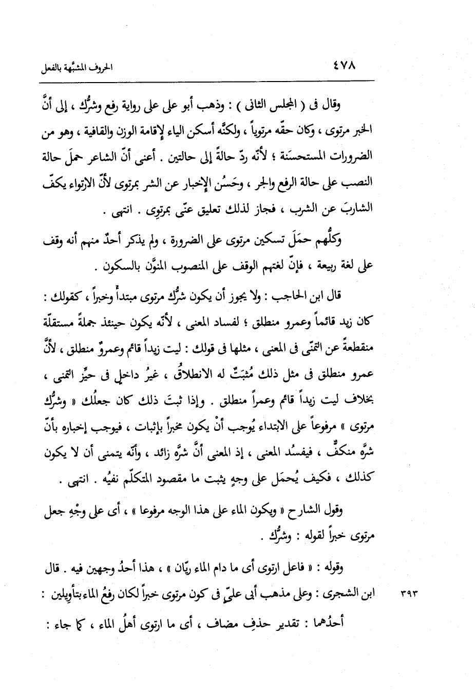 وَقَالَ فِي الْمجْلس الثَّانِي: وَذهب أَبُو عَليّ على رِوَايَة رفع وشرك إِلَى أَن الْخَبَر مرتوي وَكَانَ حَقه مرتوياً وَلكنه أسكن الْيَاء لإِقَامَة الْوَزْن والقافية وَهُوَ من الضرورات المستحسنة لِأَنَّهُ رد حَالَة إِلَى حالتين.