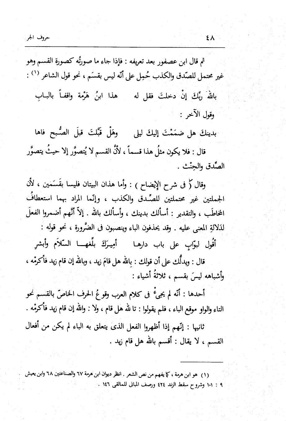 ثمَّ قَالَ ابْن عُصْفُور بعد تَعْرِيفه: فَإِذا جَاءَ مَا صورته كصورة الْقسم وَهُوَ غير مُحْتَمل للصدق وَالْكذب حمل على أَنه لَيْسَ بقسم نَحْو قَول الشَّاعِر: