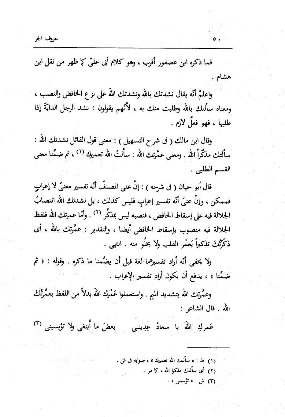 وَاعْلَم أَنه يُقَال: نشدتك بِاللَّه ونشدتك الله على نزع الْخَافِض وَالنّصب وَمَعْنَاهُ سَأَلتك بِاللَّه وَقَالَ ابْن مَالك فِي شرح التسهيل: معنى قَول الْقَائِل نشدتك الله: سَأَلتك مذكراً الله. وَمعنى عمرتك الله: سَأَلت الله تعميرك ثمَّ ضمنا معنى الْقسم الطلبي.