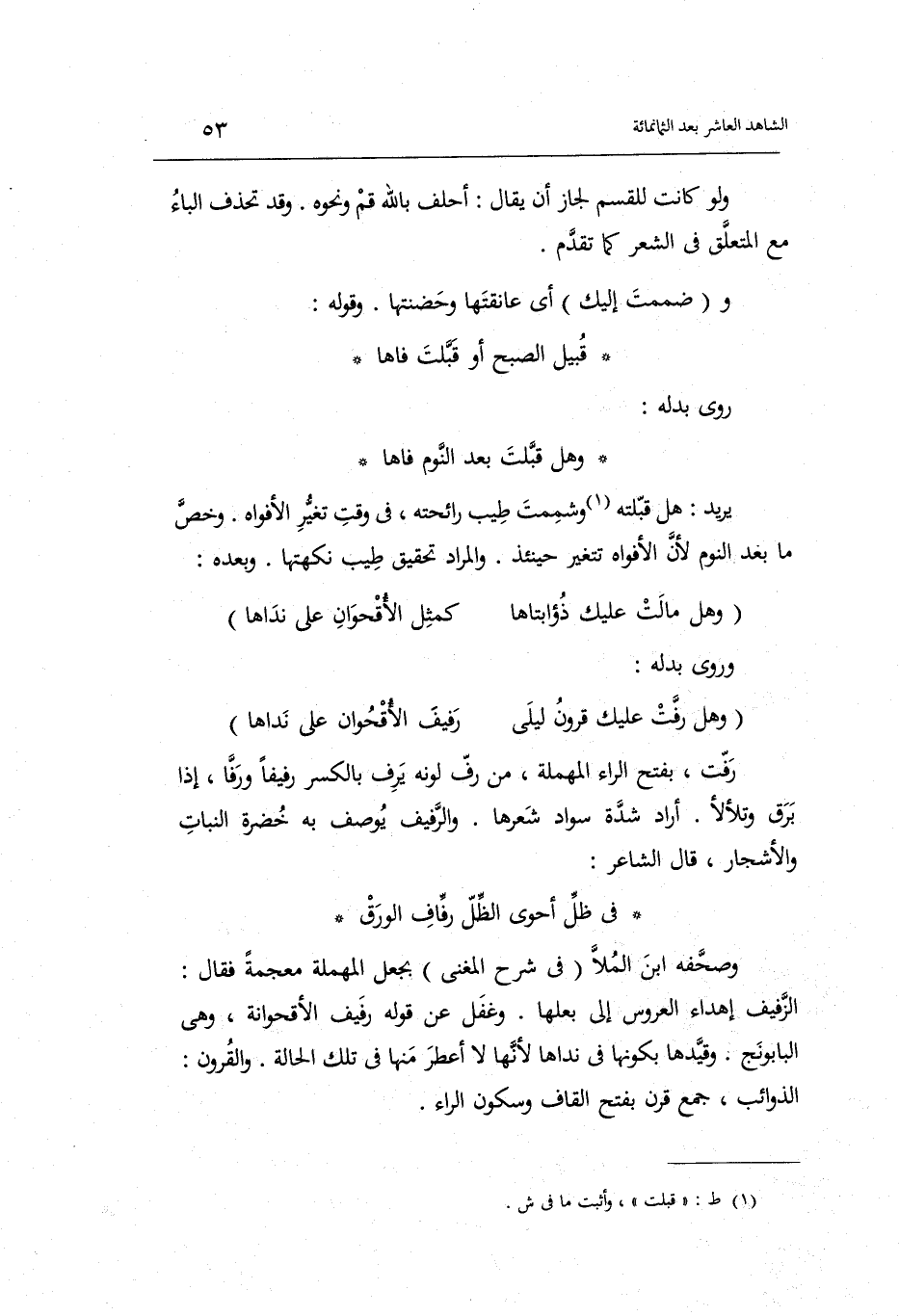 وَلَو كَانَت للقسم لجَاز أَن يُقَال: أَحْلف بِاللَّه قُم وَنَحْوه. وَقد تحذف الْبَاء مَعَ الْمُتَعَلّق فِي الشّعْر كَمَا تقدم. وضممت إِلَيْك أَي: عانقتها وحضنتها. وَقَوله: قبيل الصُّبْح أوقبلت فاها رُوِيَ بدله: وَهل قبلت بعد النّوم فاها.